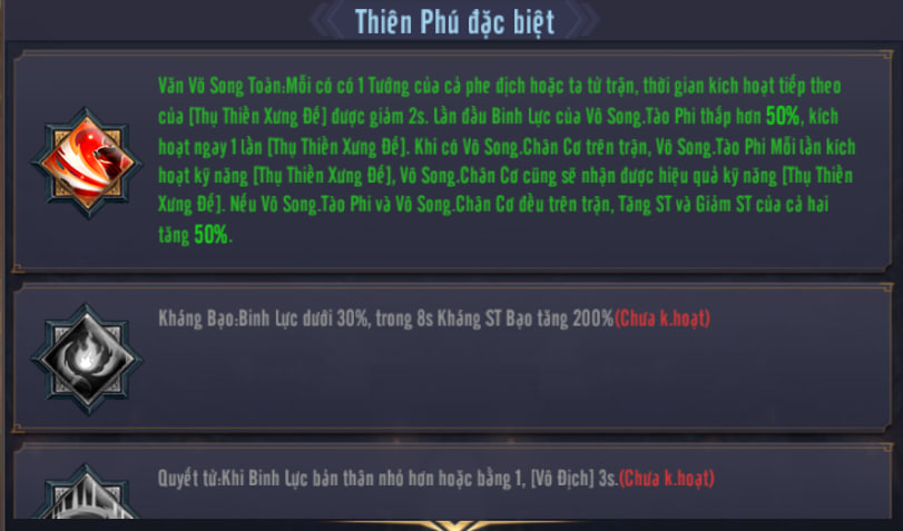 • 3. Khi Vô Song.Chân Cơ có mặt trên sân, mỗi khi Tào Phi kích hoạt kỹ năng 2, Chân Cơ cũng nhận cùng hiệu ứng.