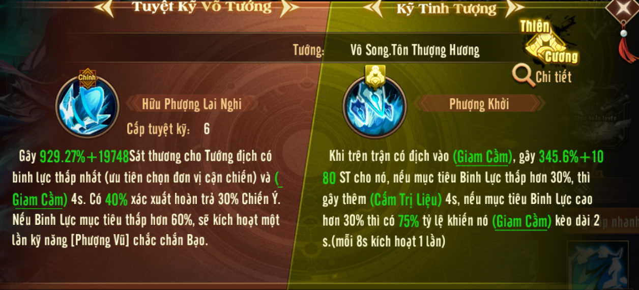 Mỗi khi thi triển Kỹ năng 1 Phượng Vũ, bản thân sẽ được tăng Công, có thể cộng dồn 10 tầng, duy trì đến hết trận. Khi các Tướng nữ phe ta bị địch làm giảm Chiến Ý, bản thân Vô Song.Tôn Thượng Hương sẽ hồi phục Chiến Ý, giá trị hồi phục bằng 40% (cấp 1) của lượng bị giảm.