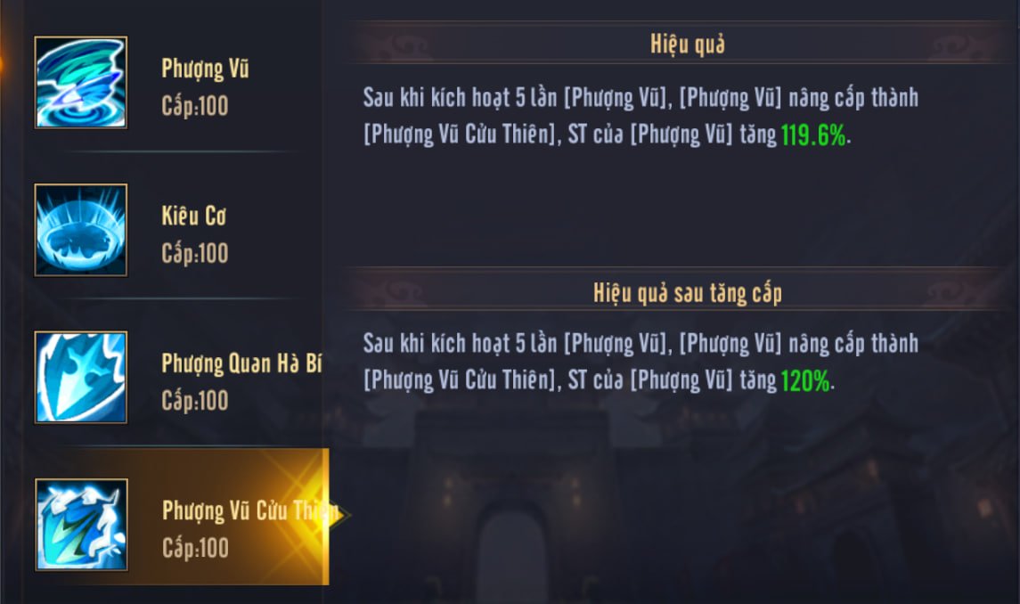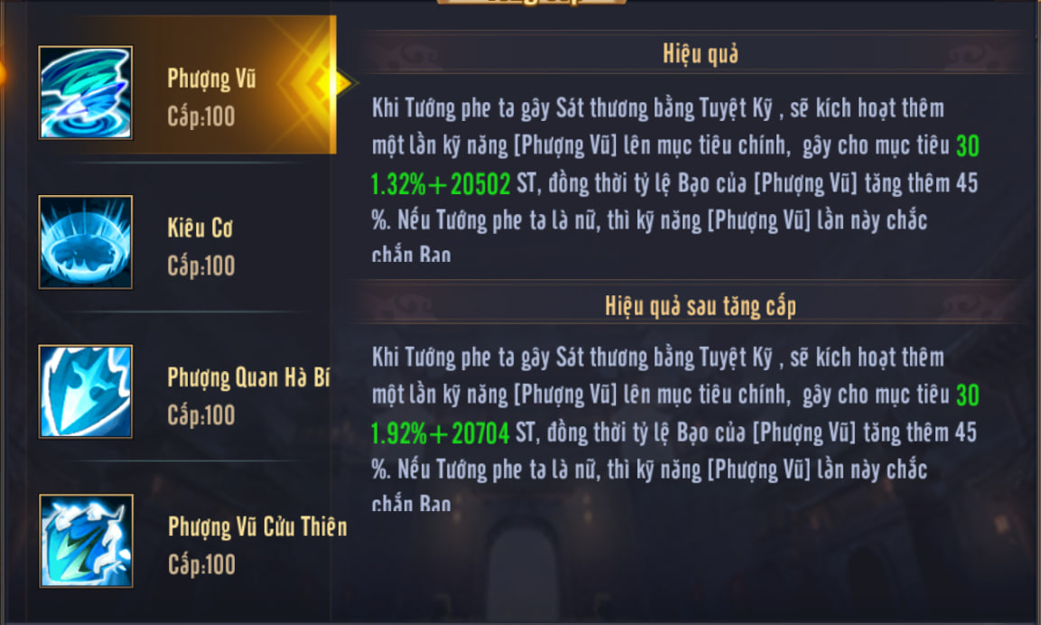 Phượng Vũ: Gây sát thương lên mục tiêu, và tỷ lệ Bạo của Phượng Vũ được tăng thêm 45%. Nếu tướng phe ta là nữ, sẽ chắc chắn Bạo.