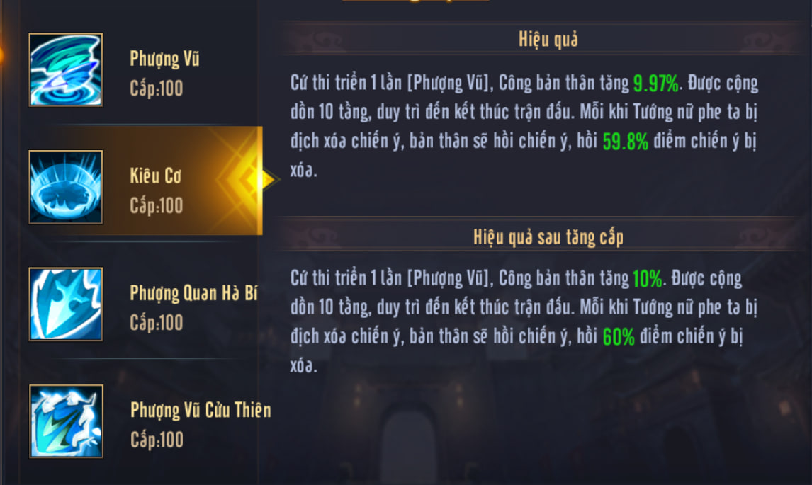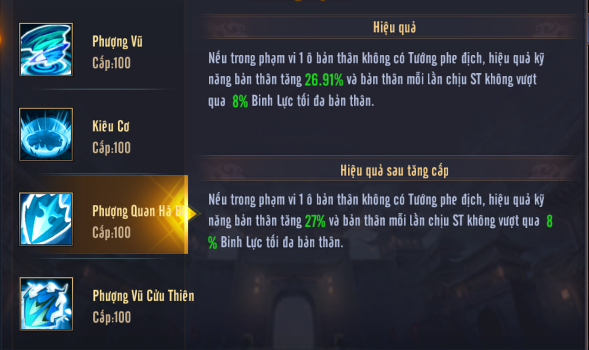 Khi Tướng phe ta gây sát thương bằng Tuyệt kỹ, sẽ gây thêm một đòn Phượng Vũ lên mục tiêu chính của họ.