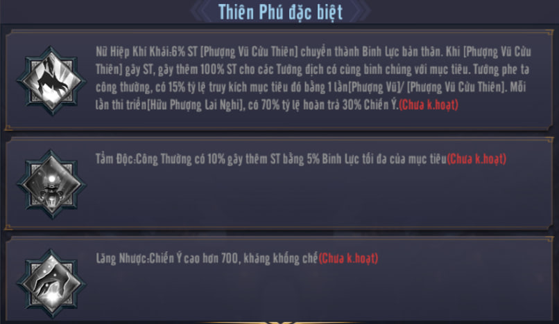 Phân tích: Điểm thứ nhất là hiệu ứng hút Binh Lực, không có gì để bàn. Trọng tâm là các điểm sau, điểm thứ hai và thứ ba tăng thêm khả năng gây sát thương diện rộng cho Vô Song.Tôn Thượng Hương. Điểm thứ tư giúp cô thi triển Tuyệt kỹ với tần suất nhanh hơn. Tất cả đều nhằm tăng cường toàn diện khả năng gây sát thương, đồng thời khắc chế đội hình có cùng binh chủng của đối phương. Ví dụ: Phượng Vũ Cửu Thiên gây sát thương lên một Tướng Thương binh. Đòn sát thương này sẽ sao chép và gây một lần sát thương tương đương lên tất cả thương binh địch.