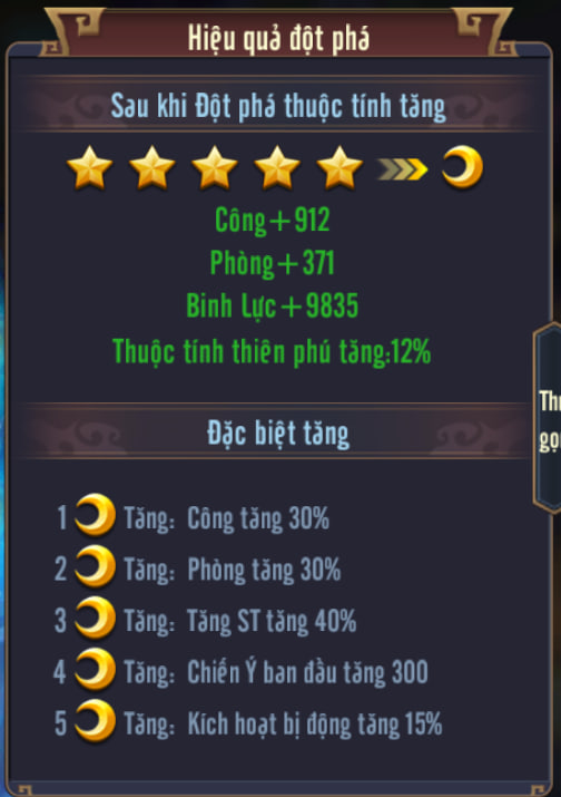 Khuyên đột phá ít nhất lên 5 Trăng, vì hiệu quả tăng sát thương, tăng 300 Chiến Ý khởi đầu, và tăng 15% tỷ lệ kích hoạt nội tại đều rất mạnh. Những Chúa công đã sở hữu vị tướng này nên nâng tối đa.