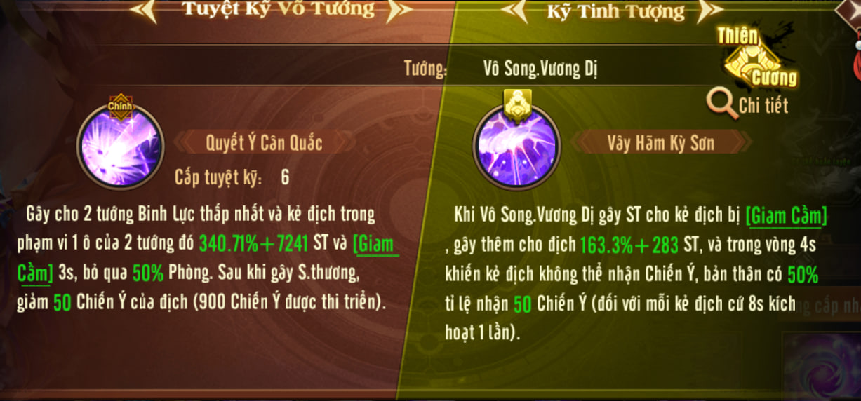 • 1. Khi Vô Song.Vương Dị gây sát thương cho kẻ địch bị Giam cầm, sẽ gây thêm sát thương.