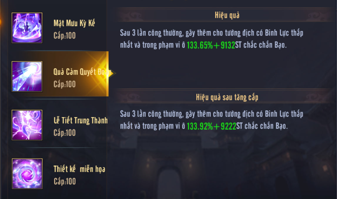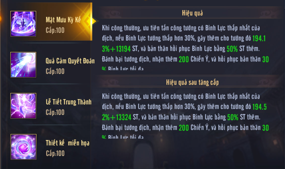 • 2. Khi mục tiêu có Binh Lực < 30%, gây sát thương bổ sung, đồng thời lượng sát thương thêm này có 50% hút Binh Lực.