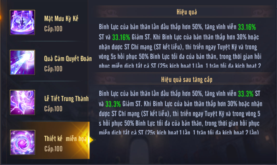 • 1. Khi Binh Lực lần đầu giảm dưới 50%, vĩnh viễn tăng 20% sát thương gây ra và 20% giảm sát thương nhận vào.