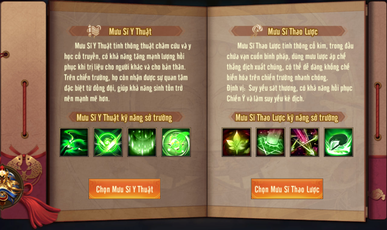 Tổng kết: Mưu Sĩ Y Thuật có kỹ năng rất độc đáo, đó là [Diệu Thủ], từ bỏ khả năng Công thường địch để trị liệu cho đồng đội (nhưng vẫn có thể gây Sát thương bằng kỹ năng), ngoài ra còn có thể hồi sinh cũng như tăng Miễn Thương, tướng hỗ trợ hồi Binh Lực chắc chắn phải chọn. Tướng khuyên dùng: Vô Song.Thái Văn Cơ,... Có thể nhiều Chúa công thắc mắc, tại sao lại không khuyên dùng cho Vô Song.Hoa Đà, vậy hãy đọc hết phân tích về Mưu Sĩ Thao Lược ở dưới để xem nên chọn Sở Trường nào nhé