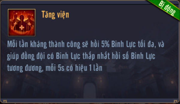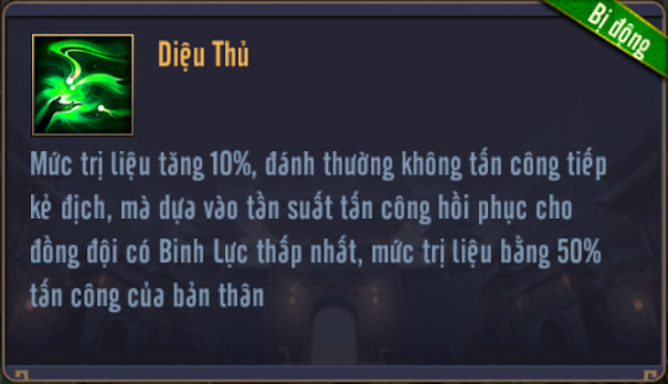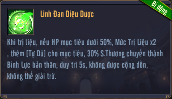 Khi trị liệu, nếu HP mục tiêu dưới 50%, Mức Trị Liệu x2, thêm [Tự Dũ] cho mục tiêu, % S.Thương sẽ chuyển thành Binh Lực bản thân, duy trì 5s, không được cộng dồn, không thể giải trừ.