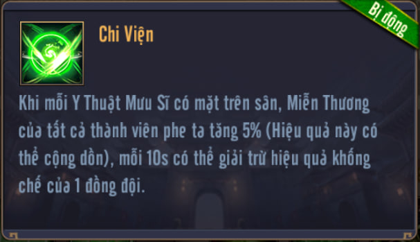 Với mỗi Y Thuật Mưu Sĩ có mặt trên sân, tăng Miễn Thương của toàn thành viên phe ta (hiệu quả này có thể cộng dồn), mỗi 10s có thể giải trừ hiệu quả khống chế của 1 đồng đội.