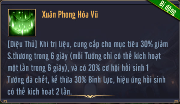 Khi trị liệu bằng [Diệu Thủ], cung cấp cho mục tiêu giảm S.thương trong 6 giây (mỗi Tướng chỉ có thể kích hoạt một lần trong 6 giây), và có xác suất hồi sinh 1 Tướng đã chết, hiệu ứng hồi sinh có thể kích hoạt 2 lần mỗi trận.