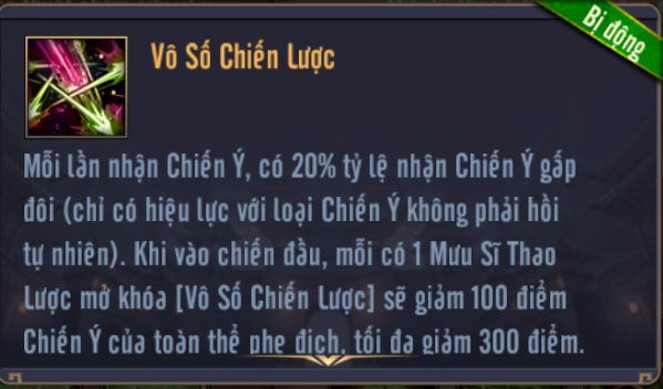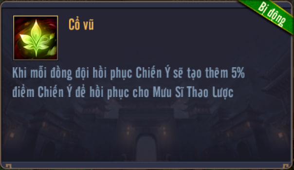 Mỗi khi đồng đội hồi phục Chiến ý, sẽ bổ sung thêm giá trị Chiến ý để hồi phục cho Mưu Sĩ Thao Lược