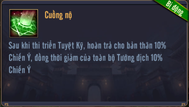 Sau khi thi triển Tuyệt Kỹ, hoàn trả Chiến Ý cho bản thân, đồng thời giảm Chiến Ý của toàn bộ Tướng địch