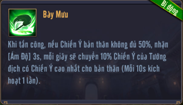 Khi tấn công, nếu Chiến Ý bản thân không đủ 50%, nhận [Ám Độ] 3s, mỗi giây sẽ chuyển % Chiến Ý của Tướng địch có Chiến Ý cao nhất cho bản thân (Mỗi 10s kích hoạt 1 lần).
