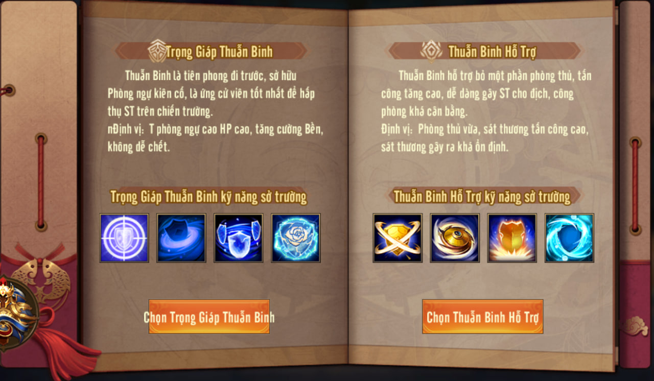 Tổng kết: chỉ cần cái tên đã nói lên tất cả, bộ kỹ năng của Thuẫn Binh Hỗ Trợ thiên về hỗ trợ đồng đội rất tốt, từ tăng Giảm ST, kéo dài thời gian buff, gánh chịu chung ST,... Tướng khuyên dùng: Vô Song.Lưu Bị, Vô Song. Lỗ Túc,...