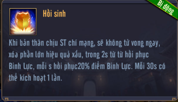 Khi bản thân chịu ST Chí mạng, sẽ không tử vong ngay, xóa phần lớn hiệu quả xấu, trong 2s từ từ hồi phục Binh Lực. Mỗi 30s có thể kích hoạt 1 lần.