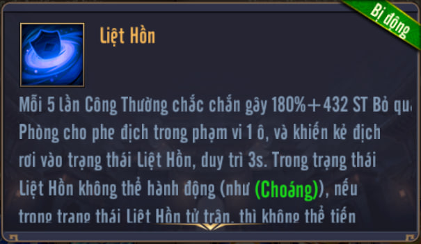 Mỗi 5 lần Công Thường chắc chắn gây ST Bỏ qua Phòng cho phe địch trong phạm vi 1 ô, và khiến kẻ địch rơi vào trạng thái Liệt Hồn, duy trì 3s. Trong trạng thái Liệt Hồn không thể hành động (như Choáng), nếu trong trạng thái Liệt Hồn tử trận, thì không thể tiến hành hồi sinh thông thường