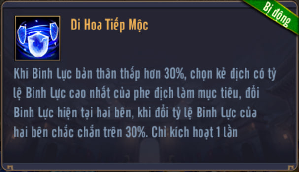Khi Binh Lực bản thân thấp hơn 30%, chọn kẻ địch có tỷ lệ Binh Lực cao nhất của phe địch làm mục tiêu, đổi Binh Lực hiện tại hai bên. Sau khi hoán đổi, phần trăm Binh Lực của cả hai bên đều chắc chắn trên 30%. Chỉ kích hoạt 1 lần