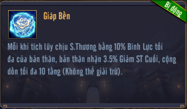 Mỗi khi tích lũy chịu S.Thương bằng 10% Binh Lực tối đa của bản thân, bản thân nhận Giảm ST Cuối, cộng dồn tối đa 10 tầng (Không thể giải trừ).