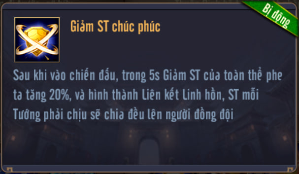 Sau khi vào chiến đấu, trong 5s tăng Giảm ST của toàn thể phe ta, và hình thành Liên kết Linh hồn, ST mỗi Tướng phải chịu sẽ chia đều lên người đồng đội