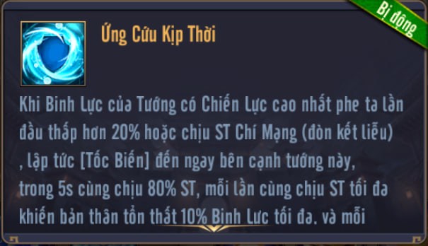 Khi Binh Lực của Tướng có Chiến Lực cao nhất phe ta lần đầu thấp hơn 20% hoặc chịu ST Chí mạng (ST kết liễu), lập tức [Tốc Biến] đến ngay bên cạnh tướng này, trong 5s cùng chịu 80% ST, mỗi lần cùng chịu ST tối đa khiến bản thân tổn thất 10% Binh Lực tối đa, và mỗi giây hồi Binh Lực tối đa cho cả 2. (Chỉ kích hoạt 1 lần)