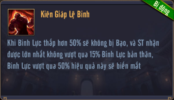Khi Binh Lực thấp hơn 50% sẽ không bị ST Bạo, và ST nhận được lớn nhất không vượt qua 15% Binh Lực bản thân, Binh Lực trên 50% hiệu quả này sẽ biến mất.