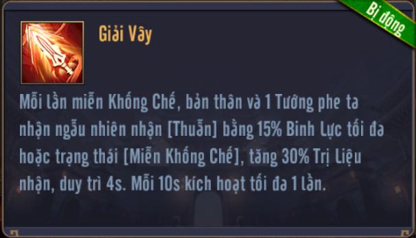 Mỗi lần miễn Khống Chế, bản thân và 1 Tướng phe ta nhận ngẫu nhiên nhận [Thuẫn] hoặc trạng thái [Miễn Khống Chế], tăng Trị Liệu nhận được, duy trì 4s. Mỗi 10s kích hoạt tối đa 1 lần.