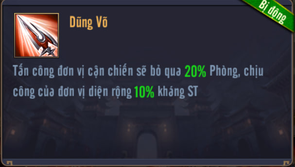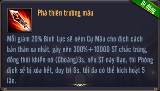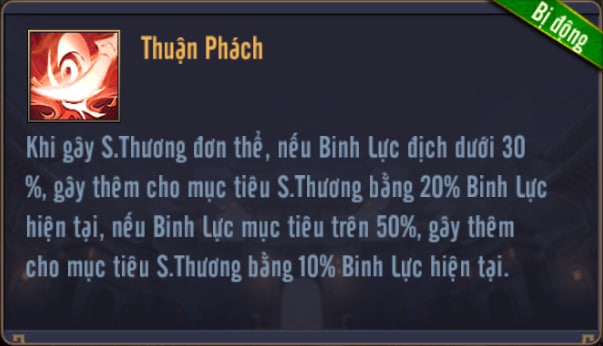 Khi gây S.Thương đơn thể, nếu Binh Lực địch dưới 30%, gây thêm cho mục tiêu S.Thương bằng % Binh Lực hiện tại, nếu Binh Lực mục tiêu trên 50%, gây thêm cho mục tiêu S.Thương bằng % Binh Lực hiện tại.