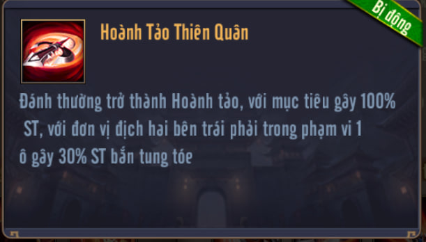 Công thường trở thành Hoành tảo, với mục tiêu gây 100% ST, với đơn vị địch hai bên trái phải trong phạm vi 1 ô gây 30% ST lan
